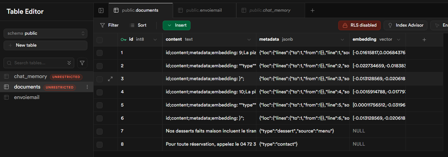Ce modèle de base de données a été utilisé pour créer un RAG (Retrieval-Augmented Generation) avec n8n, permettant de combiner génération de texte et recherche intelligente dans vos données. Pour en savoir plus, vous pouvez consulter ce tutoriel : Créer un RAG avec n8n.